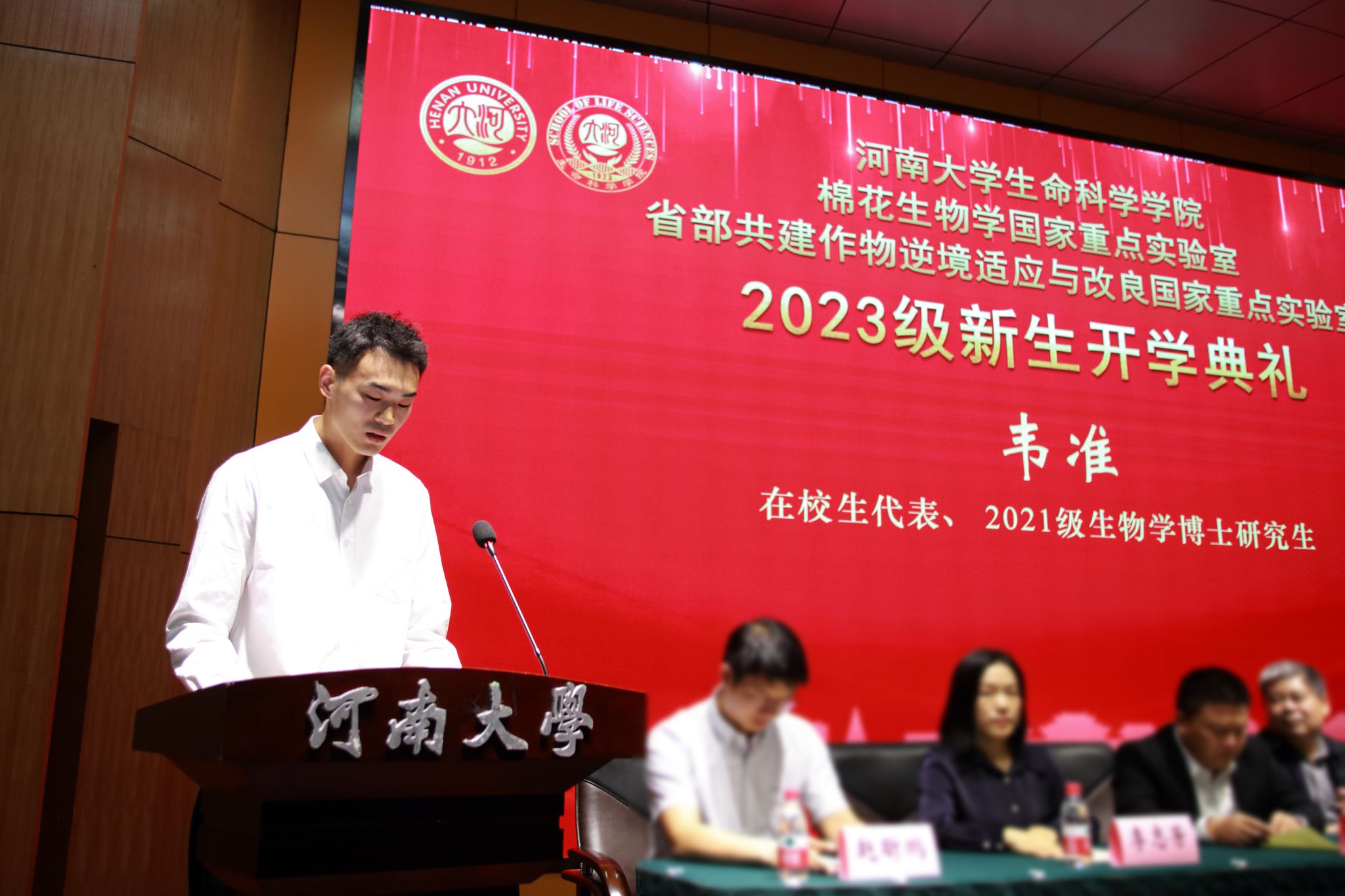 在校生代表2021级生物博士研究生韦准分享了在实验室学习的经验,激励同学们要知止而后有定、定而后能静,读书患不多、思义患不明,生而逢盛世、青年当有为。新生代表2023级植物科学与技术专业徐霏雨说身为河大学子,要熔铸“自信、拼搏、开放、创新”的新时代河大精神,努力成为祖国的栋梁之材,谱写人生华章。