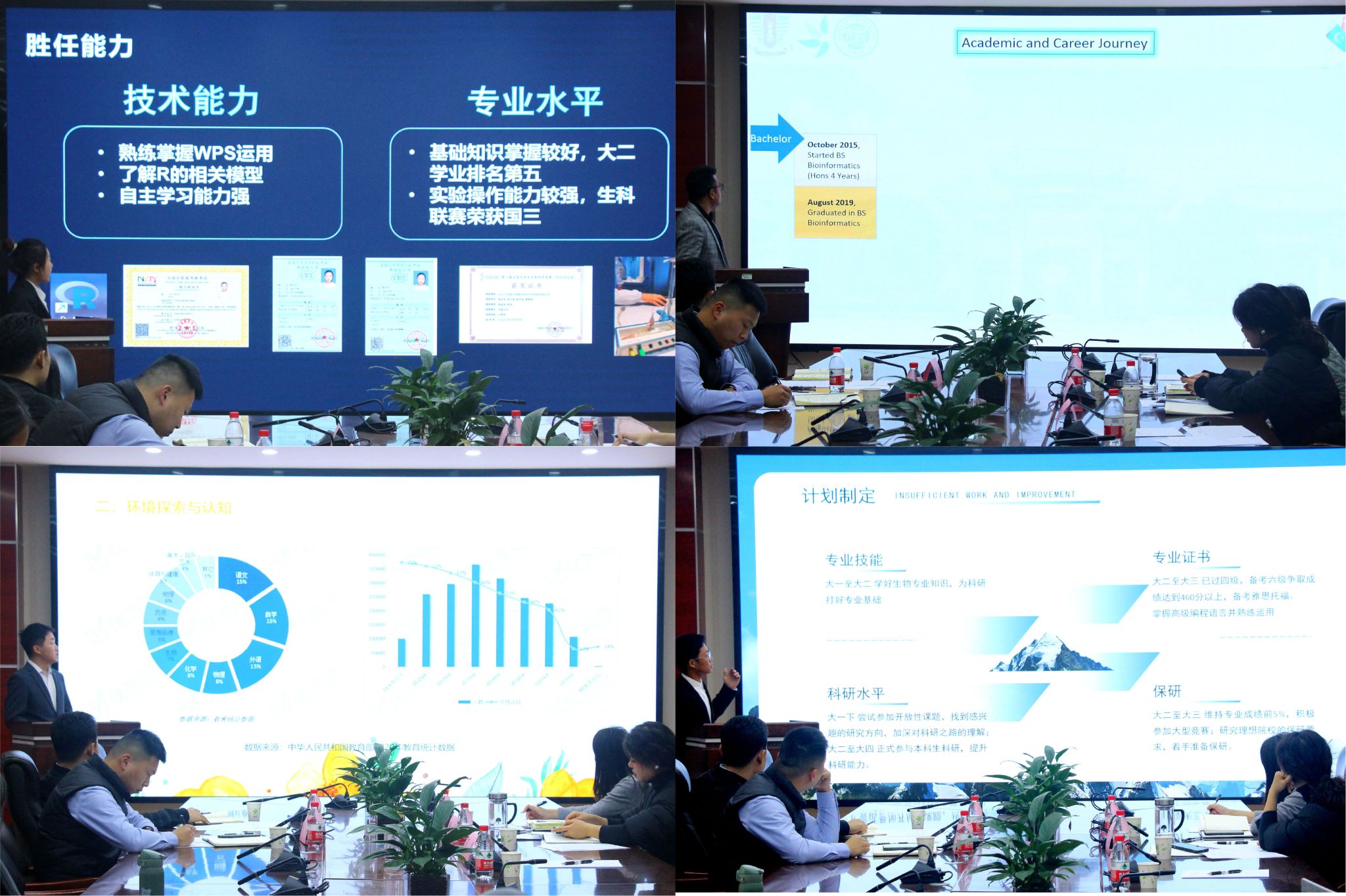 365英国上市网站官网大学生职业规划大赛分为成长赛道、就业赛道,共有400余名本、硕、博及留学生参赛,经过生涯发展报告、生涯发展PPT文稿等初赛评审,最终评选成长赛道24人、就业赛道23人参加院级决赛。在决赛个人展示环节,选手们从个人分析、职业认知、发展规划与路径实施、评估调整等几个方面对自己的职业规划和就业展望进行全面展示,汇报自身成长与实践经历,突出了契合时代要求、发挥个人特长的职业目标。各位选手“不驰于空想,不骛于虚声”,将个人理想与生活现实有机结合,有希望成为乡村教师,奉献一方教育者;有计划成为专家教授,勇攀科学高峰者;有立志成为科普宣传员,传播生物科学文化。选手们的精彩表现引得现场阵阵掌声,尤其是巴基斯坦籍博士留学生Roshan的精彩展示更是将比赛推向高潮,充分展现了生物学科国际化人才培养的平台优势。